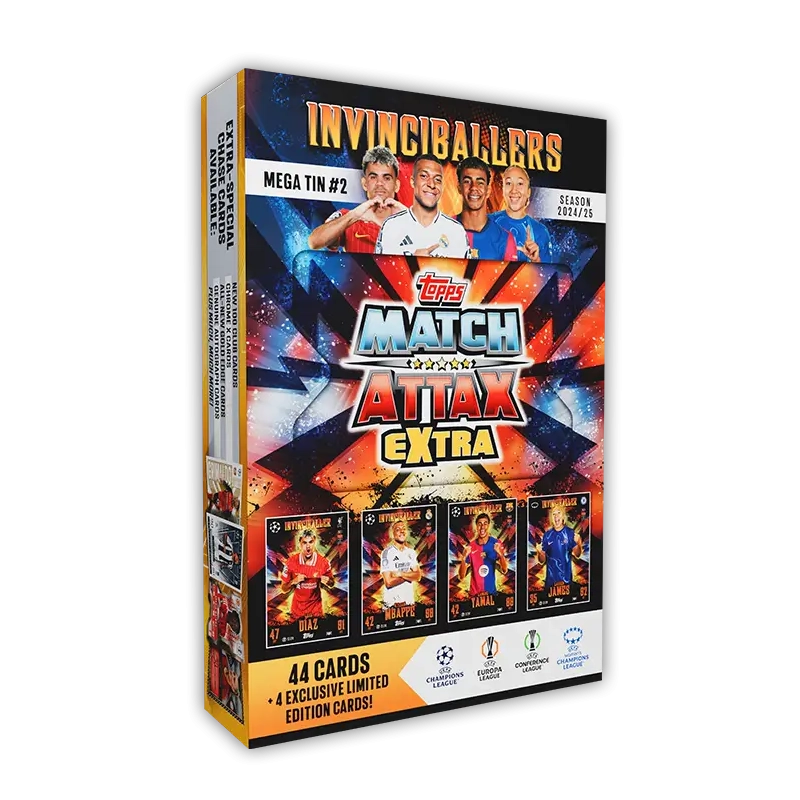 Unleash the power of the game’s elite with the Match Attax Extra 2025 Mega Tin #2 – The Invinciballers! This collectible tin includes 48 trading cards, featuring 4 exclusive Invinciballers limited edition cards. Packed with all-new designs and categories like UCL Knockout Masters, Midfield Shield, and Defensive Rock, this set brings the best of the UEFA Champions League to your collection. Keep an eye out for ultra-rare relic cards, including player-worn relics and autograph jumbo relic cards inside lucky tins. With stunning Chrome X, Black Edge, and Gold Edge cards, this collection is a must-have for soccer fans and collectors alike.
