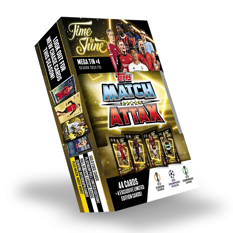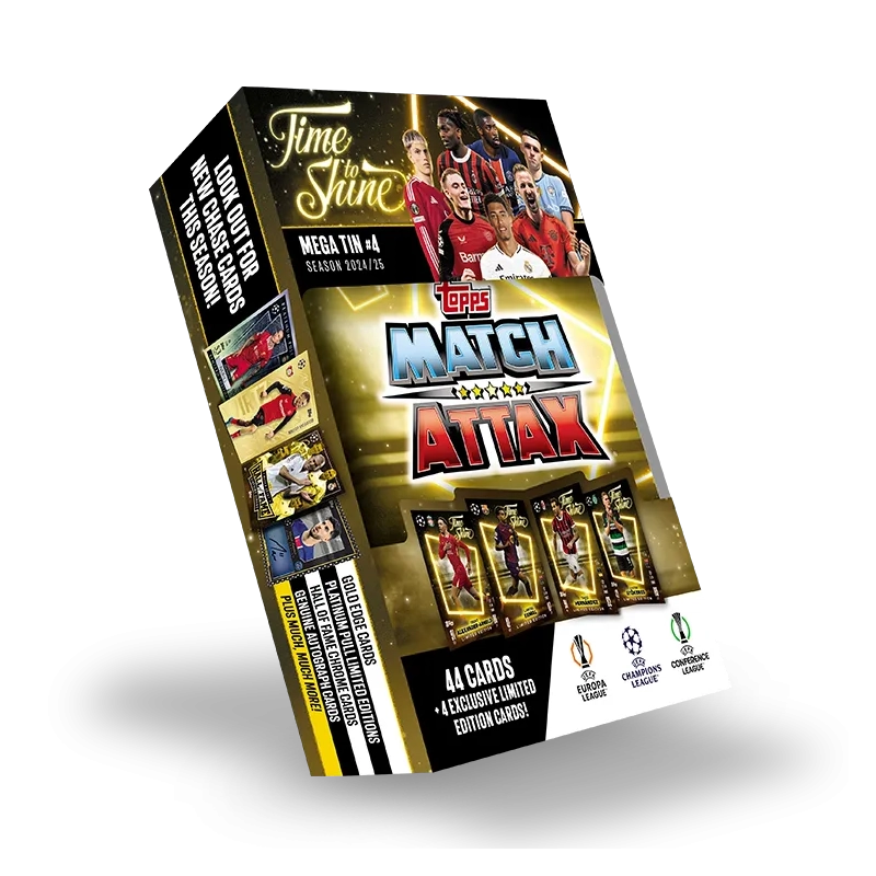 Complete your collection with the Match Attax 24/25 Mega Tin ‘Time to Shine’ – Tin #4! This exciting tin includes 44 Match Attax cards and 4 exclusive Limited Edition cards featuring Trent Alexander-Arnold, Lamine Yamal, Theo Hernández, and Viktor Gyökeres. Featuring some of the top players from the UEFA Champions League, UEFA Europa League, and UEFA Europa Conference League, this tin is a must-have for fans and collectors. Chase ultra-rare Relic or Jersey Worn Relic cards exclusive to Mega Tins and explore card categories like 100 Club, Chrome Shields, and Vintage Vibes. Don’t miss out on Tin #4!